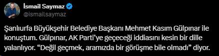 Gazeteci İsmail Saymaz’a konuşan Gülpınar, AK Parti’ye geçeceği yönündeki iddiaları kesin bir dille reddetti. Saymaz, sosyal medya hesabından yaptığı paylaşımda, “Şanlıurfa Büyükşehir Belediye Başkanı Mehmet Kasım Gülpınar ile konuştum. Gülpınar, AK Parti’ye geçeceği iddiasını kesin bir dille yalanlıyor. ‘Değil geçmek, aramızda bir görüşme bile olmadı’ diyor” ifadelerine yer verdi. Böylece Gülpınar, siyasetteki geleceğine ilişkin tartışmalara son noktayı koymuş oldu.