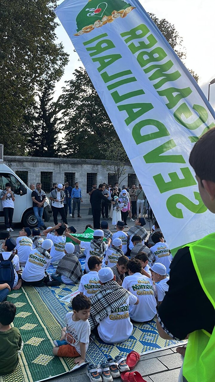 Valide-i Cedid Camii önünde yürüyüşü sonlandıran çocuklar tekbirler getirdi.